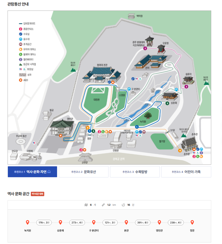 청와대는 총 1.2km 거리의 역사문화 코스를 운영하고 있으며, 도보 40분 내외로 관람할 수 있습니다.
