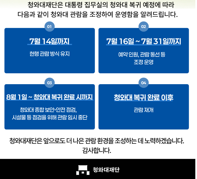 📢 청와대 관람 일정이 곧 종료됩니다. 청와대재단의 공식 공지에 따르면, 7월 14일까지는 기존 운영 방식이 유지되고, 7월 16일부터 7월 31일까지는 관람 인원 및 동선이 조정됩니다. 이후 8월 1일부터는 보안 점검 등을 위해 관람이 임시 중단될 예정입니다.