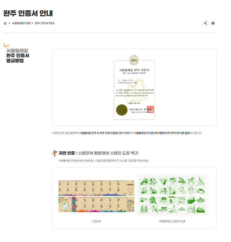 스탬프 찍고 → ‘스탬프북’ 채우고 → 완주 후 안내센터에 제출하면 완주 인증서까지 발급됩니다.