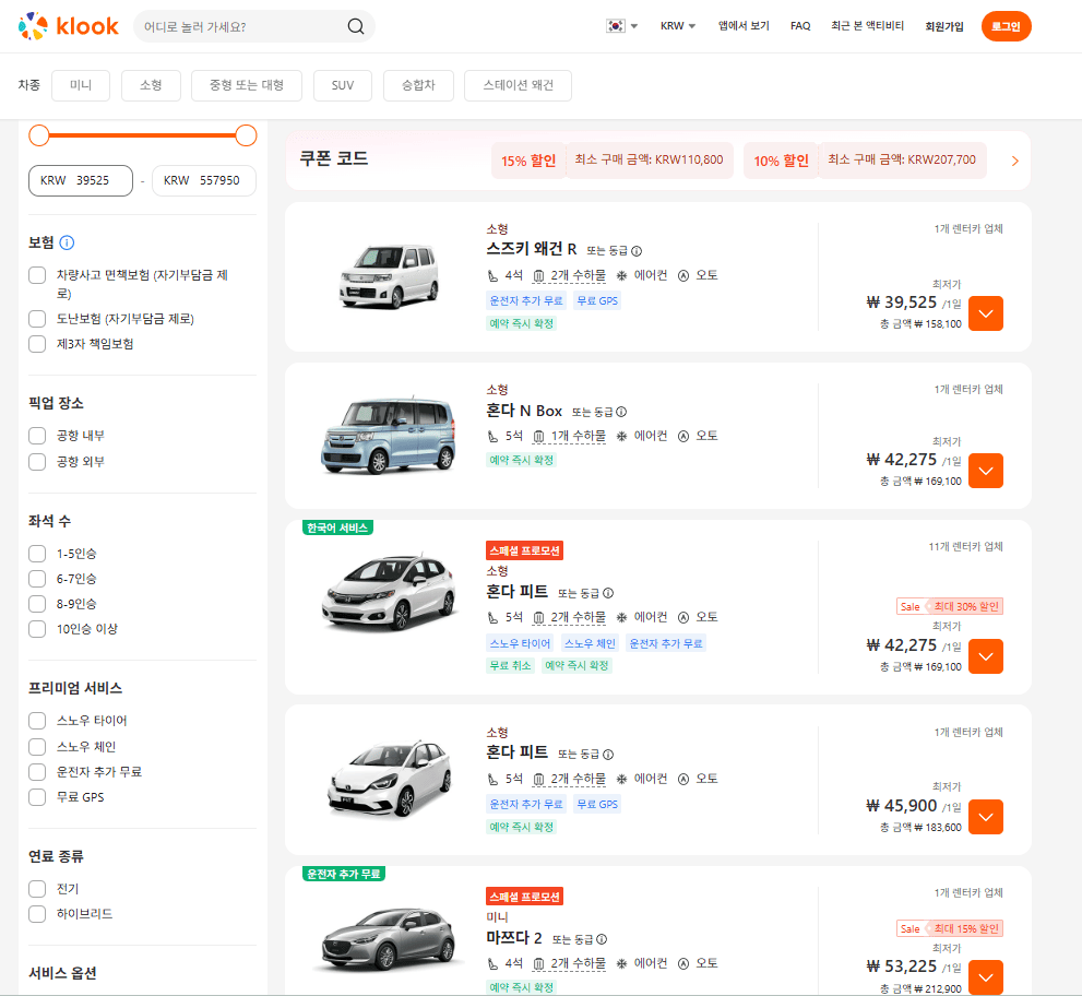 클룩 홈페이지의 렌트카 화면. 홋카이도 신치토세공항 기준 가격입니다.