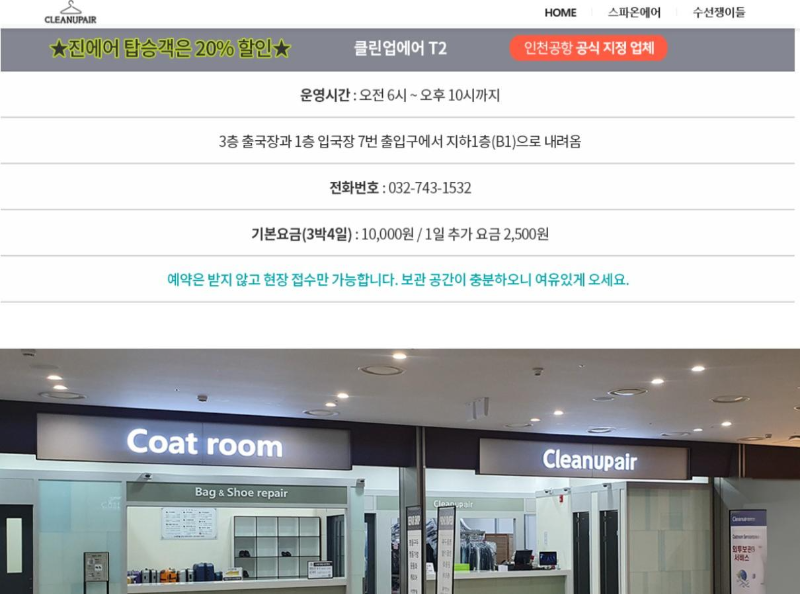 - 위탁장소: 제1터미널은 지하1층 12번 출입구의 크린업에어와 5번 출입구의 스파온에어사우나에서, 2터미널은 지하1층 7번출입구 크린업에어에서 보관 접수를 받습니다. 예약은 받지 않고 현장접수만 가능합니다.