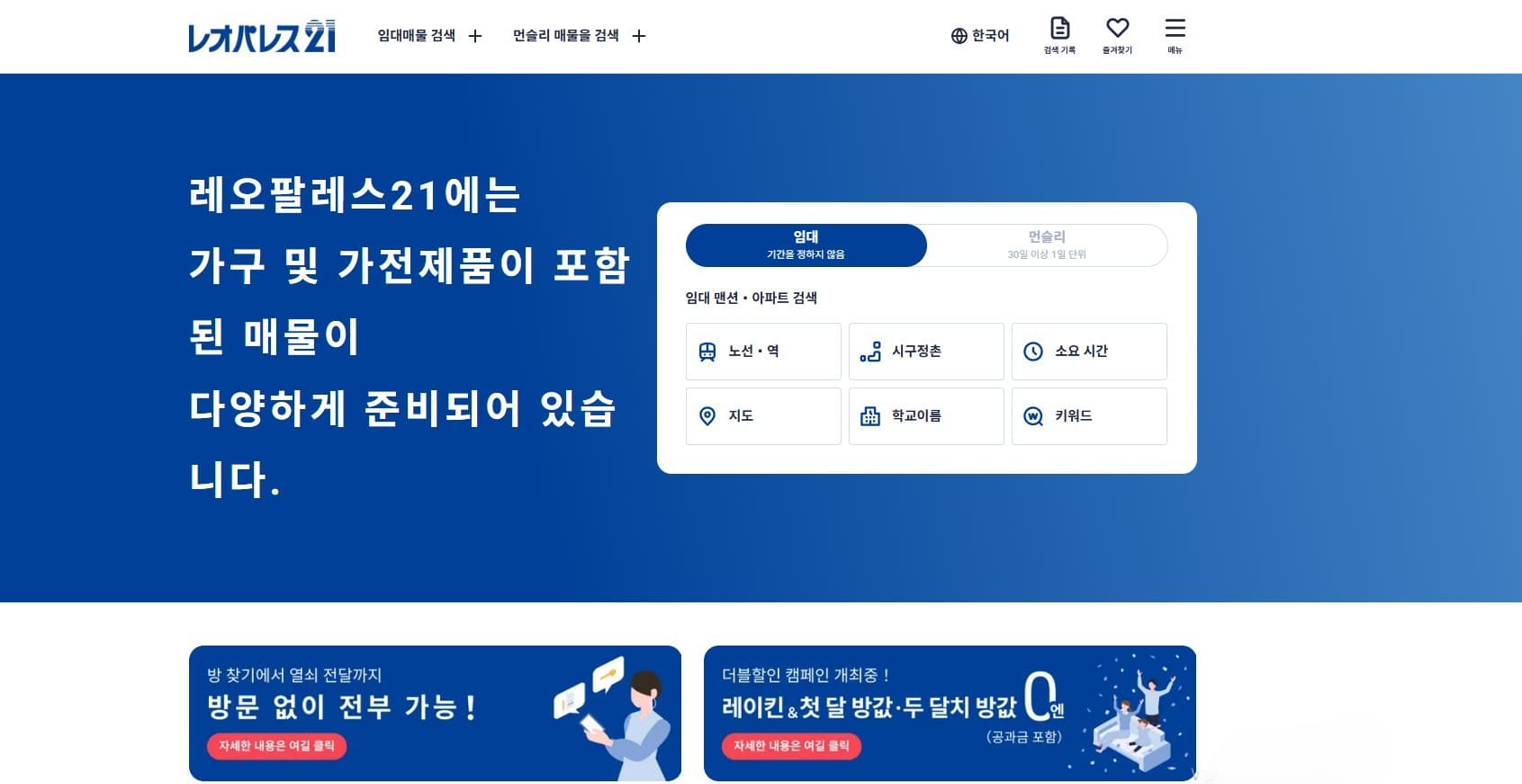 - 레오팔레스 (Leopalace): 가구와 가전제품이 모두 갖춰져 있어 단기 렌트로 인기가 많습니다.